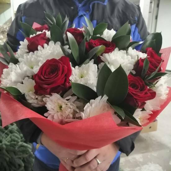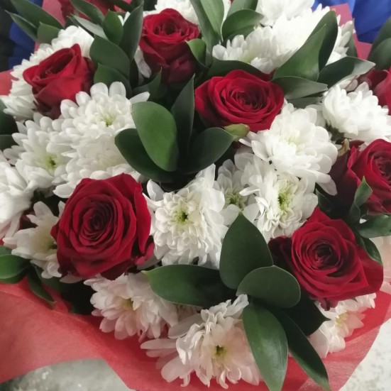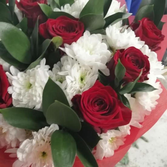 Букет «Бордовые розы и белые хризантемы» в Волжском