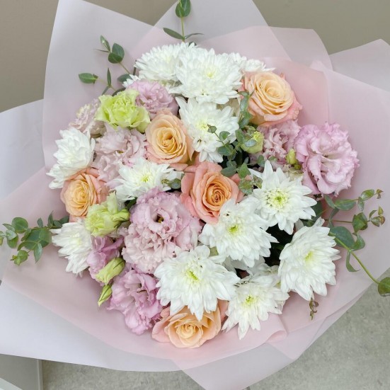 Букет из роз, хризантем, эустомы
