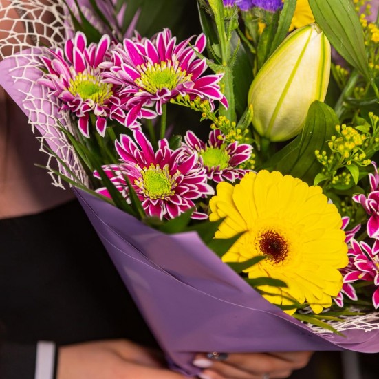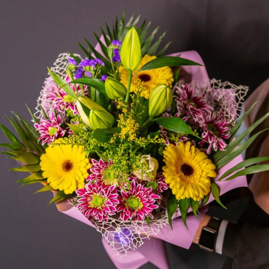 Букет с розами, хризантемами, лилиями, герберами в Волжском