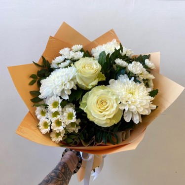Букет «Белые хризантемы с розами»